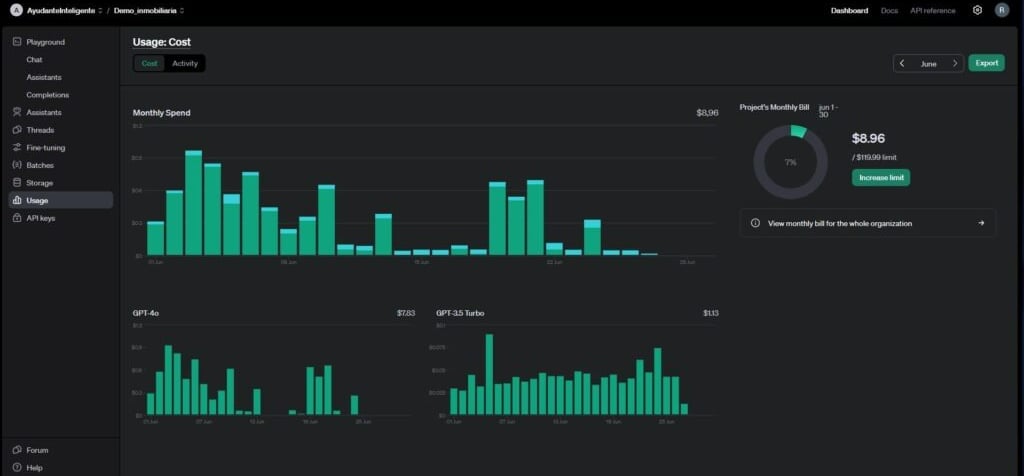 El uso de inteligencia artificial tiene un coste en función del número de usuarios que tenga la aplicación, estos consumos serán accesibles para la inmobiliaria, puedes asignar una presupuesto máximo para estos consumos variables, y nunca te pasarás de ese TOPE presupuestario.